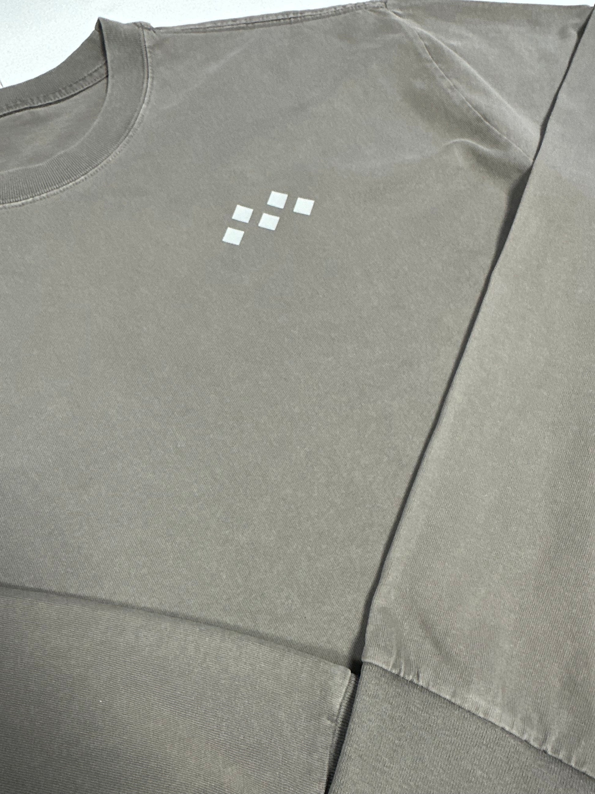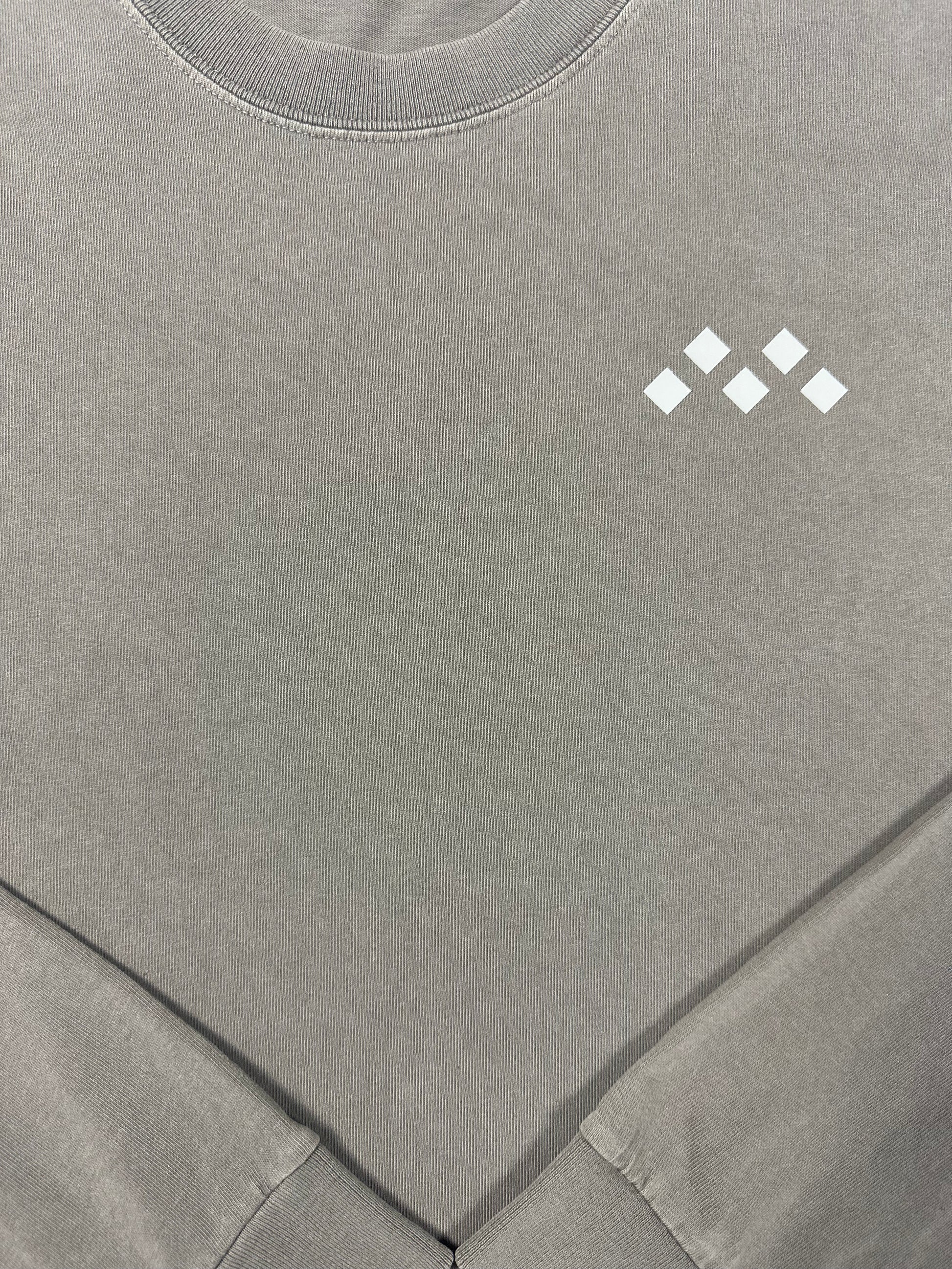 This long sleeve brings together the perfect balance of weight, comfort, and minimal design. The garment-dyed faded grey fabric gives each piece its own character, while the lighter-grey vinyl logos add dimension without overpowering the clean profile. Ideal for layering, everyday wear, and pairing with any outfit from casual to elevated street minimalism.